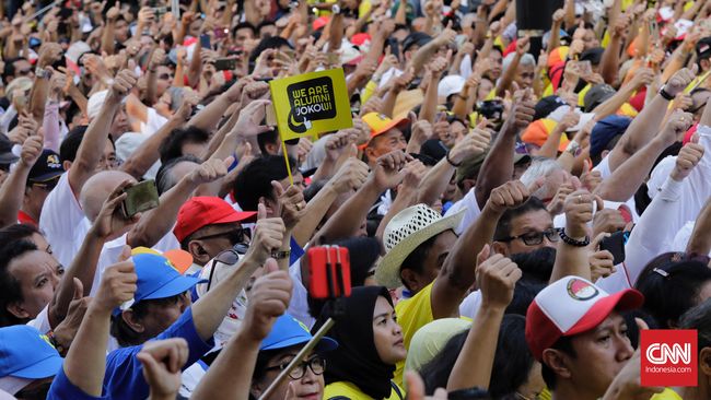 Ribuan orang berkaus kuning pada Sabtu (12/1) memadati kawasan Plaza Tenggara Gelora Bung Karno, Senayan, Jakarta, untuk mengikuti deklarasi dukungan terhadap Jokowi-Ma'ruf.