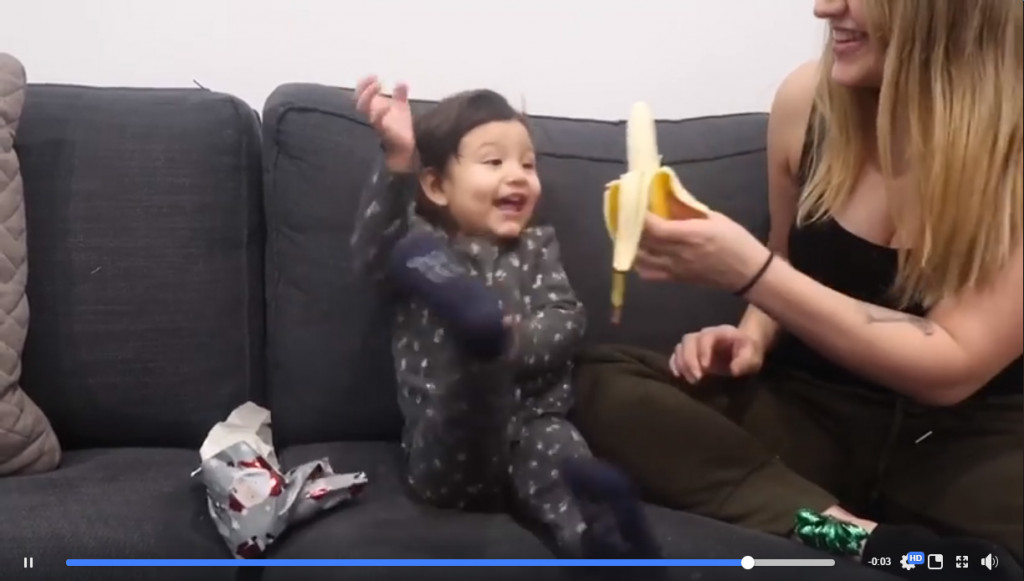 がっかりするかと思いきや、目を見開き足をバタバタさせて「バナナ!」「嬉しい!」と大喜び。これは予想外の反応だオーマイガー!