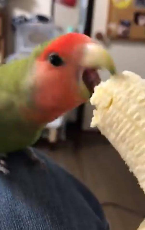 コザクラインコがバナナを食べる動画に「狩って仕留めながら食べてますね」感嘆の声多数 (2020年3月28日) - エキサイトニュース - エキサイトニュース