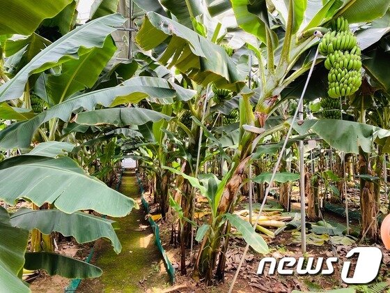지난 23일 방문한 하우스 안에는 성인 남자 3~4명의 키를 합쳐 놓은 높이의 바나나 나무들이 빽빽이 서 있다. 줄지어 선 바나나 나무들을 보고 있으니 마치 동남아에 와 있는 듯한 느낌이 들었다.