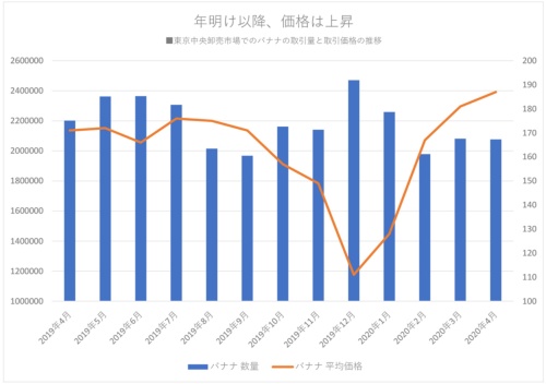 やはり少なくとも一部ではバナナの値上がりが起きていたようだ。先ほどとは異なる別のスーパーに問いあわせてみると、4月後半からは一時的に「相場は1.5倍強になっていた」との証言も。東京中央卸売市場のバナナの取引量と平均価格の推移を見てみると、2019年12月をピークに取引量は減少傾向にある中で、価格は確かに上昇していた。