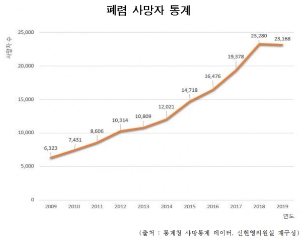 바이러스성과 세균성 폐렴 등을 모두 포괄한 최근 10년간 폐렴 사망자 수는 2009년 6,323명에서 2019년 23,168명으로 3.7배 증가하는 뚜렷한 증가세를 보였다.