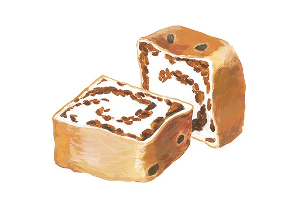 林檎の甘酸っぱさと甘く芳醇なシナモンの風味のきいた、カスタードクリームでおりなすハーモニーが楽しめる食パン。(生地に卵使用)。