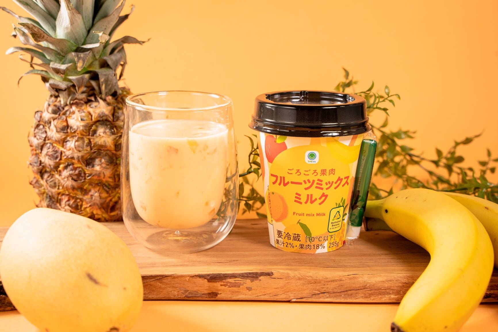 このたび第2弾の取り組みとして発売する「ごろごろ果肉フルーツミックスミルク」も、規格外品のバナナを使用するとともに、マンゴーとパインアップルの果肉、オレンジとリンゴの果汁を乳製品に加えることで、ごろごろとした果肉感とフルーティーな味わいが楽しめるドリンクに仕上げました。