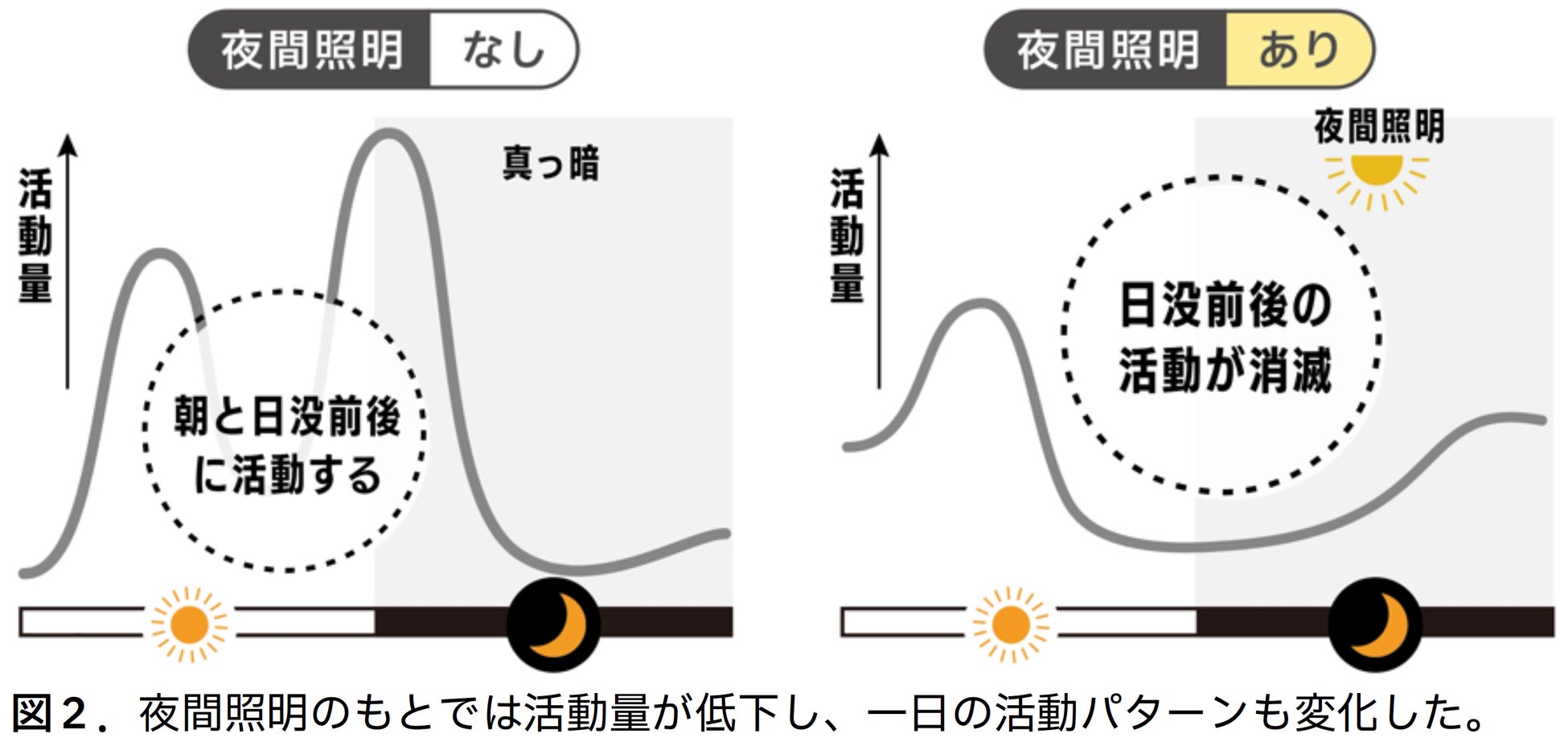 たとえば、都市群の個体では、夜間照明による活動量の減少幅が小さくなっていたり、夜間にも活発に活動するような進化が起きていることがわかりました(詳細後述)。また、都市群の個体では、郊外群の個体に比べて、高温への耐性が高く、低温への耐性が低いことも明らかになりました。本研究のように、都市化によって生じたさまざまな環境ストレスが生物に与える影響やそれに対抗して生じる生物の進化を理解することは、都市における各生物種の栄枯盛衰を理解するだけではなく、都市化に伴った生物の減少を最小化するための方策を考える上で重要な知見となると期待されます。本研究は国際学術誌のEcology and Evolution誌に2022年12月13日9:00(日本時間)に公開されます。