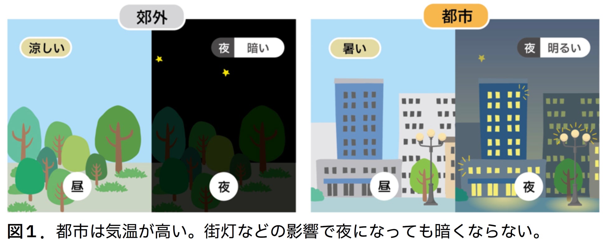 現在、全世界で都市の面積が拡大しています。都市化の進行は、生物の減少や絶滅の原因の一つであると考えられています。都市化は、森林や草原といった生物の生息地を奪うだけではなく、残された生息地の環境を変化させることが知られています。街灯や住宅内の照明に由来する夜間の人工光(光害)や、気温の上昇が代表的な例です(図1)。