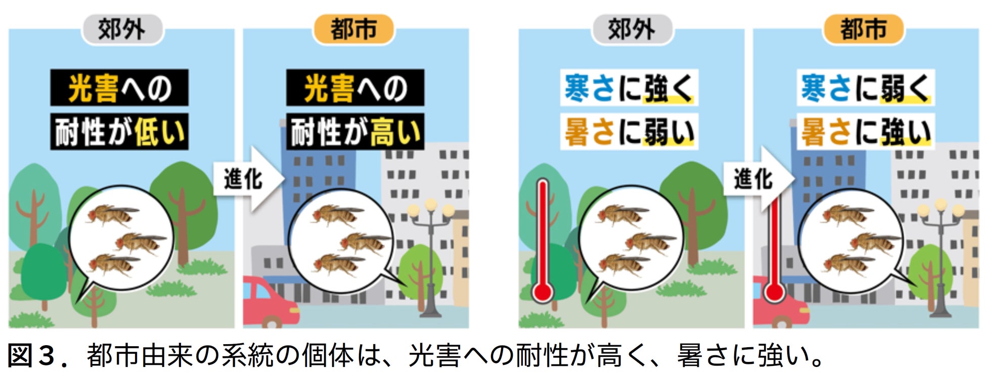 一方で、郊外群の個体と都市群の個体の比較から、都市に暮らす生物が都市のストレスに対抗して「急速に進化」していることも示唆されました(図3)。