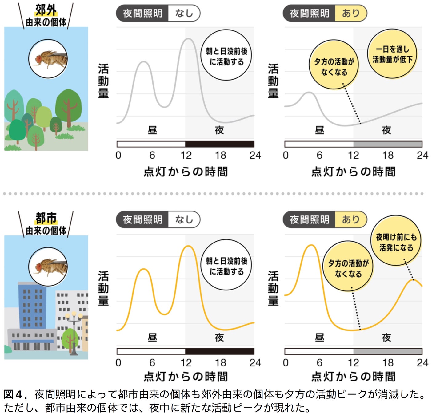 千葉大学大学院理学研究院の高橋佑磨准教授と大学院融合理工学府の佐藤あやめ大学院生(当時)はオウトウショウジョウバエを対象に、都市化に伴った環境変化が昆虫に与える影響を評価しました。まず、関東地方の都市部と郊外でオウトウショウジョウバエを採集し、これらを実験室で繁殖させ、それぞれのグループ(郊外群と都市群)に分けて、実験を行ないました。実験室内で「夜間照明のある環境」で飼育すると、「夜間照明のない環境」で育った個体に比べて、成虫の活動量が低下し、かつ、一日の活動パターンが大きく変化することがわかりました(図2)。このことは、夜間人工光が昆虫の生活に大きな影響を与えることを示唆しています。
