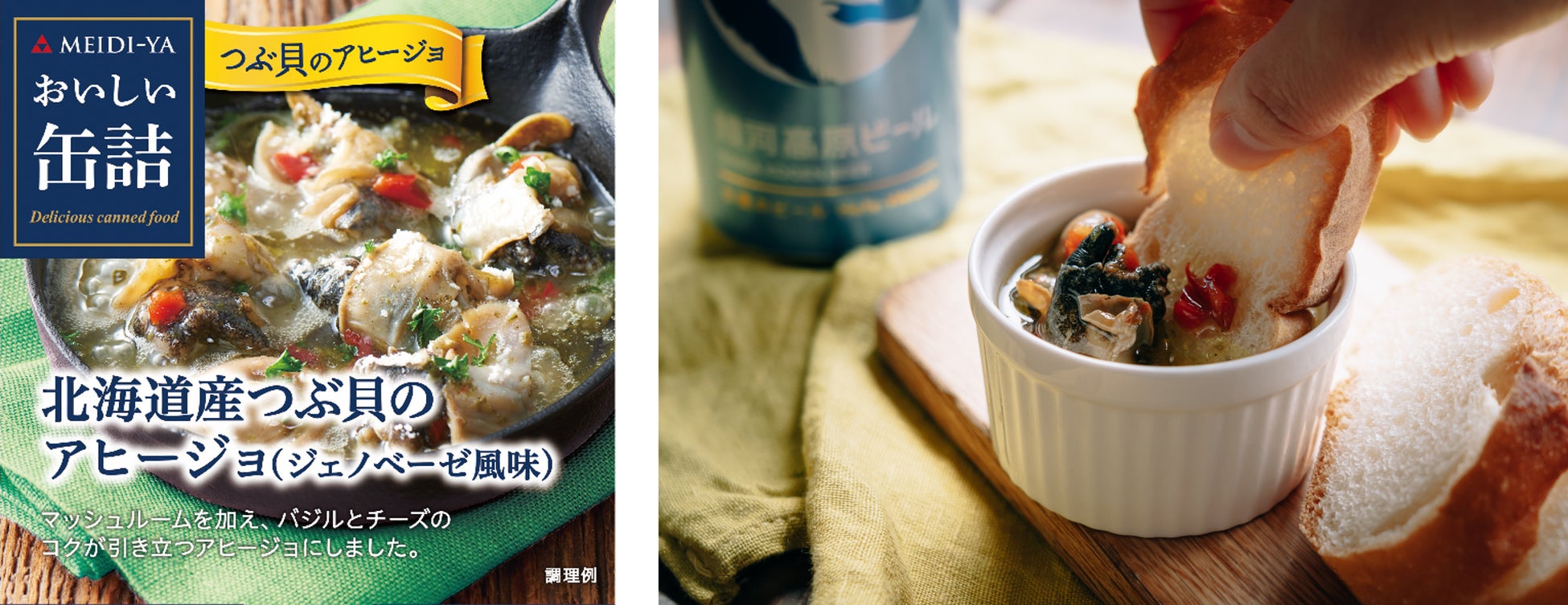北海道産つぶ貝とマッシュルームを、香り高いバジルとチーズのコクが引き立つジェノベーゼのアヒージョにした「北海道産つぶ貝のアヒージョ(ジェノベーゼ風味)」とバゲットのセット。「銀河高原ビール 小麦のビール」はバジルなどの香草と相性抜群。香りの余韻を感じやすいペアリングとなり、同時につぶ貝とマッシュルームの風味もアップ。