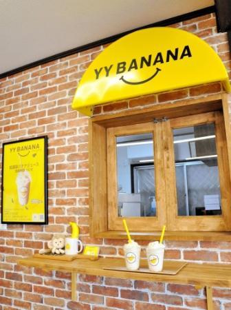 22年7月に販売開始。「インスタ映えするように」と、店の奥にバナナジュースのコーナー「YY BANANA」を設けた。受け渡し窓の上にひさしを作り、バナナをイメージした黄色のロゴで統一感を出した。店頭にはバナナジュースの黄色ののぼりがはためく。